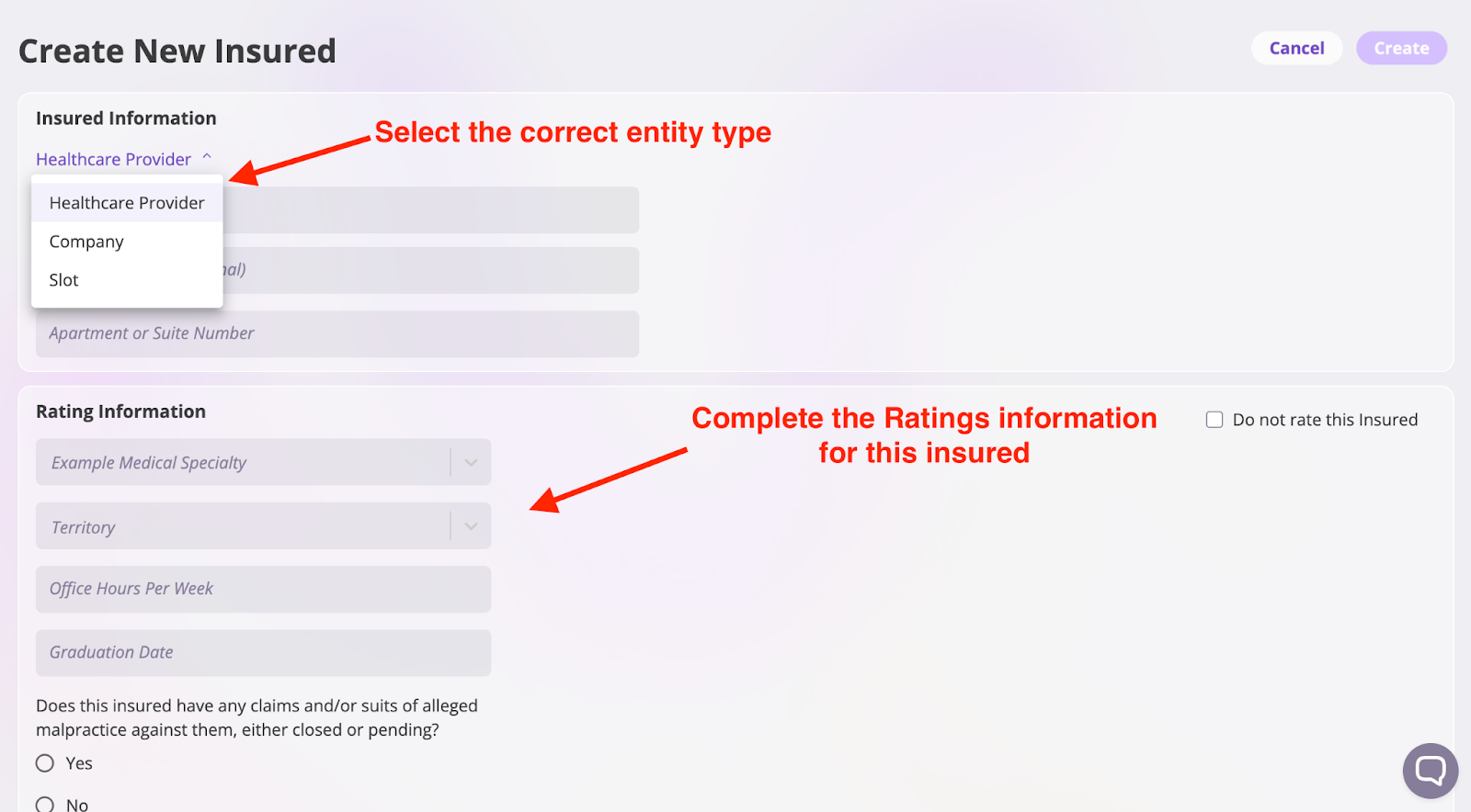 - Select the appropriate entity type with a rating question (e.g. a Healthcare Provider’s specialty) and enter information for the insured. Click Create when finished.
