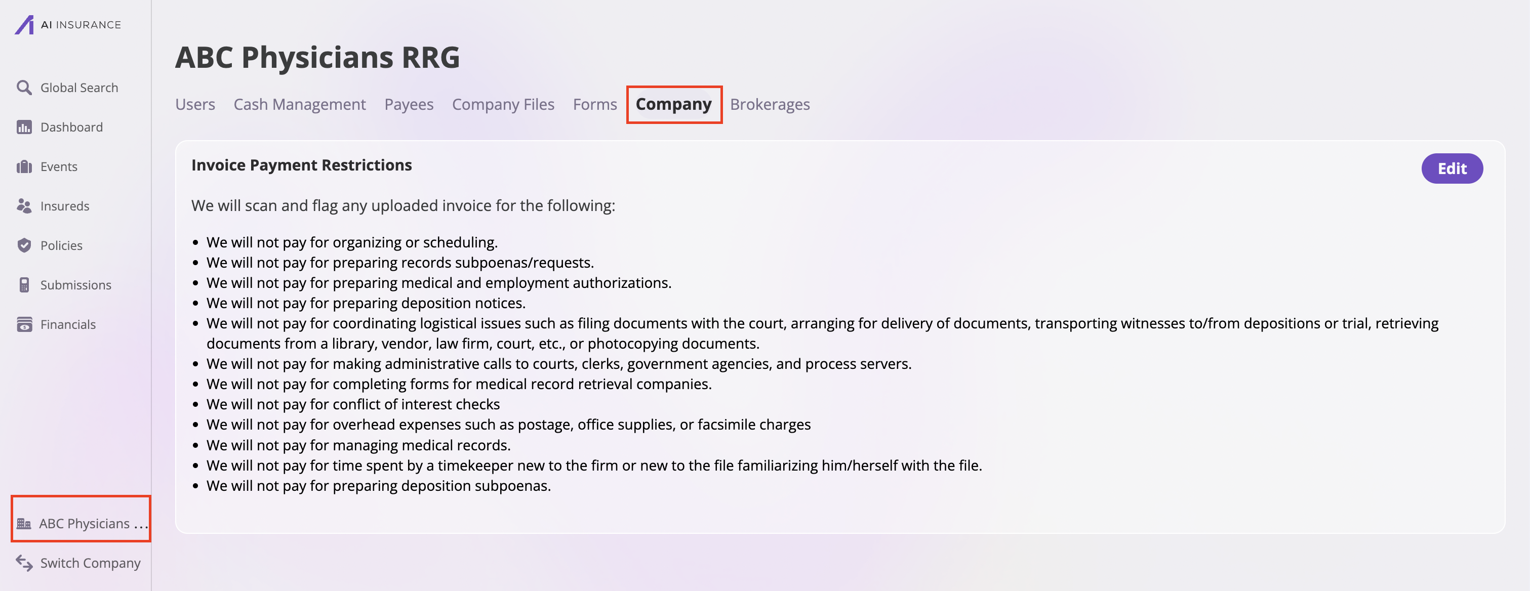 Follow these steps to get started with the Invoice Audit service:- Go to your company settings by clicking your company name in the sidebar and selecting the Company tab.