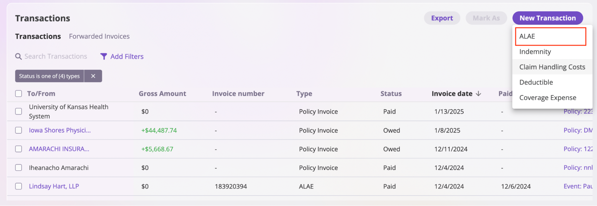 - Under the Transactions section, click New Transaction and choose ALAE from the options.