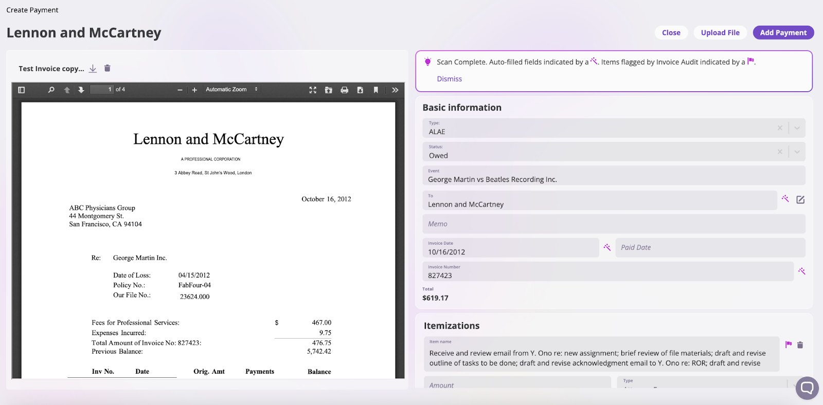 After uploading an invoice, the platform will parse the data and automatically fill in as many fields as possible. Your results will look like this: