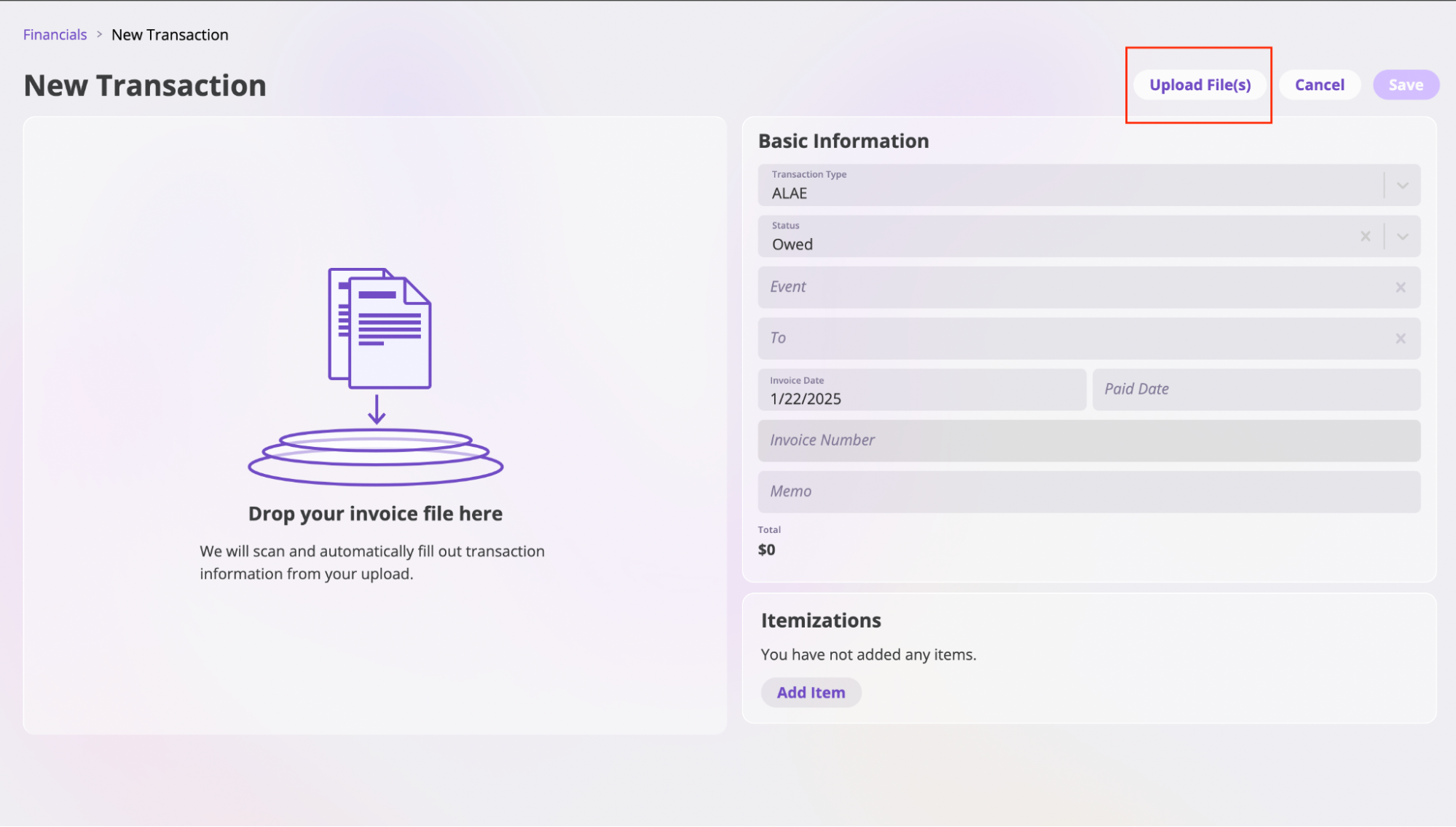 - On the New Transaction page, upload your invoice using one of the following methods: a. Drag and drop a file from your desktop or Outlook email. b. Click Upload File(s) in the top-right corner to select your file.