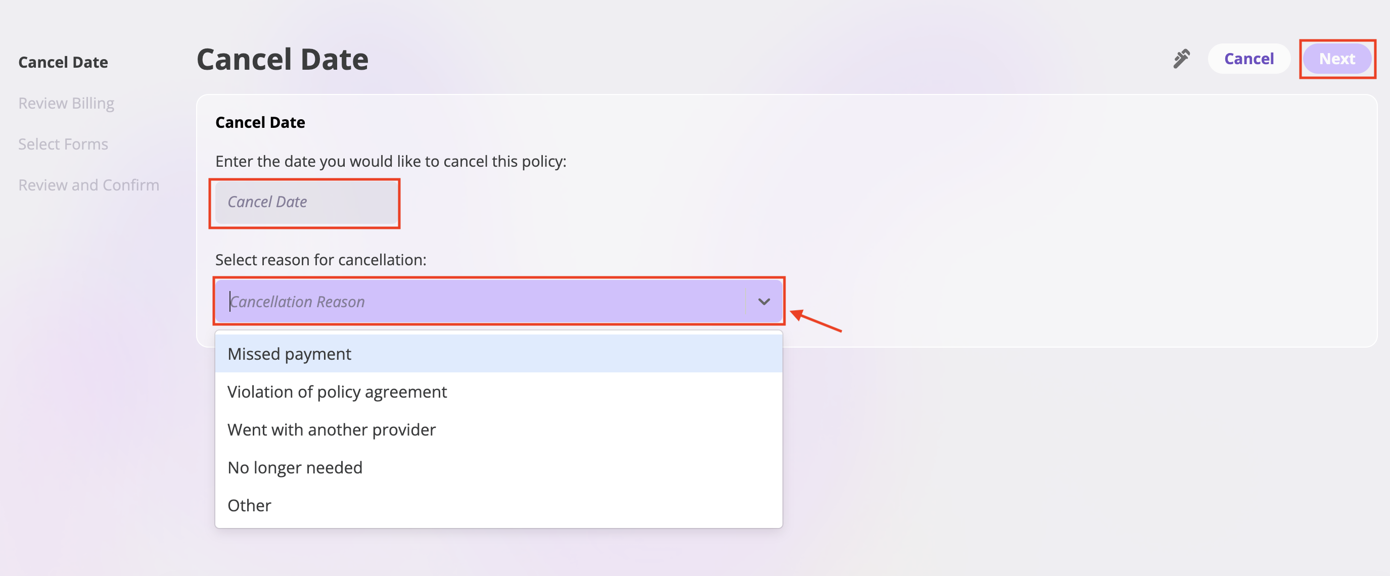 The system will open a “Cancel Date” form with the following steps:Cancel Date Section