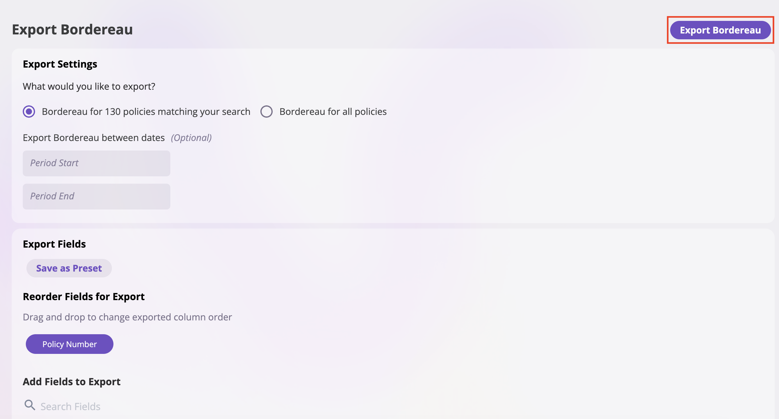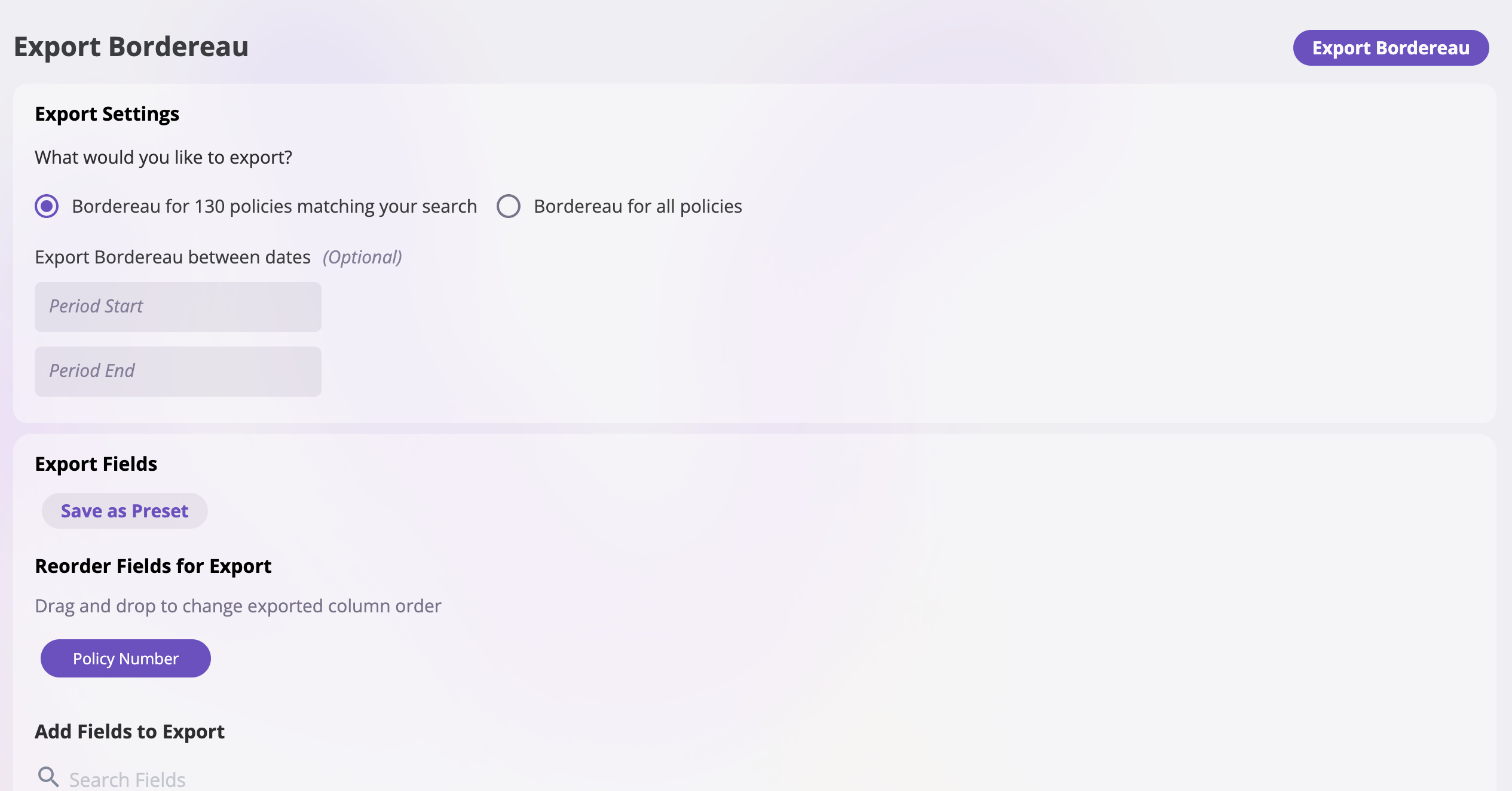 - Export Bordereau: Exports one row for every change to the policy, providing a detailed history of all modifications, endorsements, and updates
