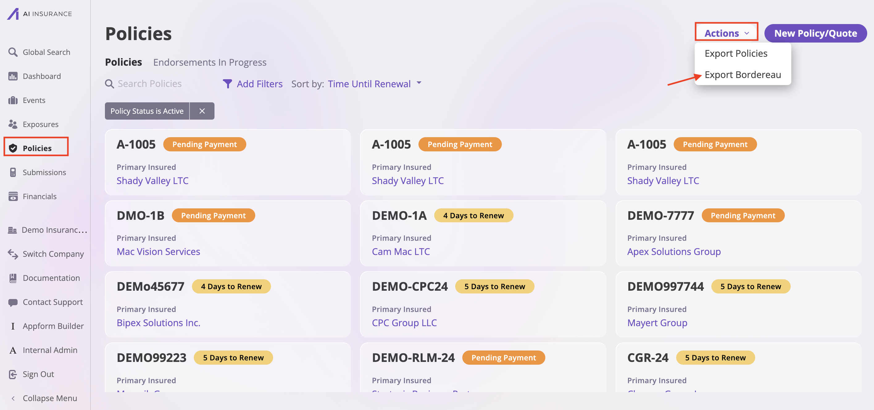 Follow these steps to export a policy bordereau:Any filters applied on the Policies page will carry over to the export. Make sure to apply your desired filters before exporting.