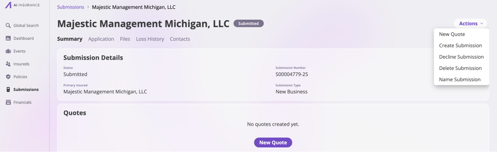Navigate to the Actions tab and choose one of the following options: New Quote, Create Submission, Decline Submission, or Delete Submission.